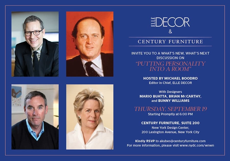 Elle Decor & Century Furniture invite you to a what's new. What's next discussion on "Putting Personality Into A Room".